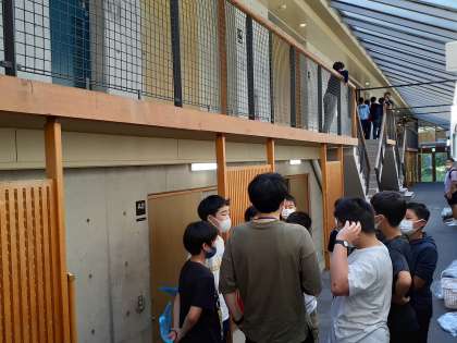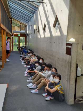 宿舎に入り、これから避難訓練を始めます。班長が打ち合わせをし、避難経路を確認しました。
