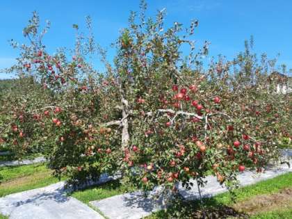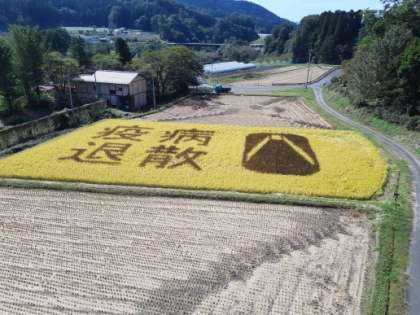 田園プラザに着く前に、吊り橋があり、その下に稲の種類を変えて、文字が浮き上がっていました。