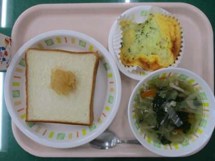今日の給食は、食パン、手作りりんごジャム、フレンチエッグ、ベーコンと野菜のスープ、牛乳です。今日は、今が旬の紅玉りんごを使ってジャムを作りました。紅玉のほどよい酸味が、ジャムにぴったりです。