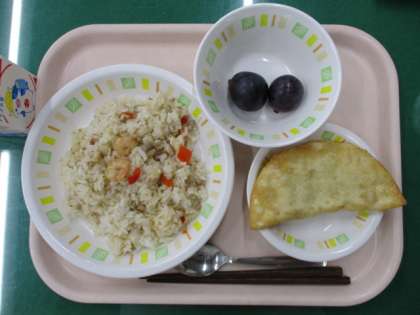 今日の給食は、ナシゴレン、ツナとポテトのパリッと揚げ、ぶどう(ピオーネ)、牛乳です。ツナとポテトのパリッと揚げは、ゆでてつぶしたじゃがいもに、ツナ、チーズ、しその葉を混ぜて餃子の皮に包み、油で揚げて作ります。しその香りが味のポイントです。