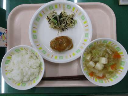 今日の給食は、ごはん、つくね焼き、野菜ののりあえ、豆腐汁、牛乳です。つくねには、大きめに切ったれんこんを入れました。シャキシャキした歯ごたえがおいしく、子どもたちにも人気がありました。