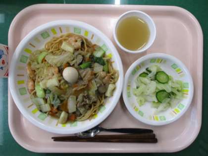 今日の給食は、五目あんかけそば、やさいのごま風味、すりおろしりんごゼリー、牛乳です。すりおろしりんごゼリーは、りんごジュースの中に、すりおろしたりんごを入れて作りました。給食では、ゼラチンと寒天を両方使ってゼリーを固めています。子どもたちにも人気があり、おかわりのじゃんけんをしているクラスが見られました。