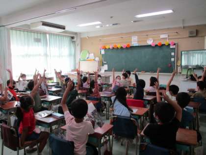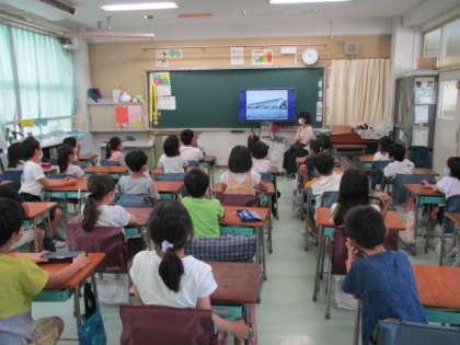 10月15日(金Iに、開校65周年記念集会を行いました。校長先生から65年の歩みのお話があり、続いて代表委員会で作成した、65年の歩みの映像を、クラスのテレビモニターで観ました。65周年にちなんだクイズでは、各教室で盛り上がり、最後に校歌もしっかりと全校で歌うことができました。それぞれの教室で、放送を聞きながらの集会でしたが、心あたたまるすてきな時間を全校で過ごしました、