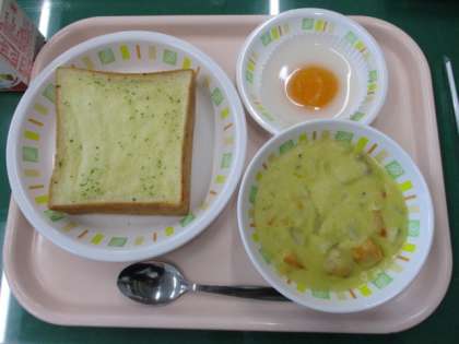 今日の給食は、ガーリックトースト、パンプキンシチュー、おかしな目玉焼き、牛乳です。今日はハロウィンメニューです。かぼちゃを使ったシチューと、おかしな目玉焼きを作りました。おかしな目玉焼きは、見た目は目玉焼きですが、カルピスゼリーの中に杏を入れたデザートです。