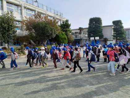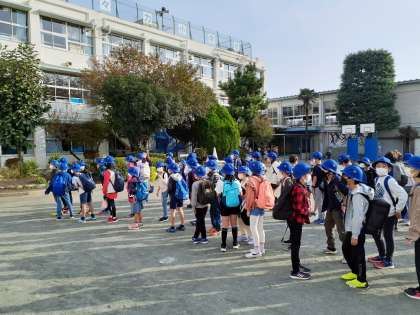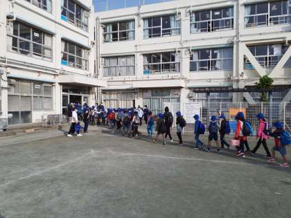 4年生、4クラス、122名全員揃って出発しました。