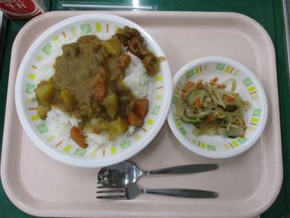 今日の給食は、カレーライス、福神漬け、こんにゃくサラダ、牛乳です。カレーには欠かせない野菜、玉ねぎ。今日も朝から調理師さんが、玉ねぎを黒くなるまでじっくりと炒めてくれました。この「アメ色玉ねぎ」が、おいしいカレーの秘訣です。じっくり炒めた玉ねぎはとても甘く、カレーの味に深みを出してくれます。