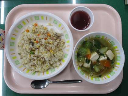 今日の給食は、チャーハン、豆腐とチンゲン菜のスープ、ぶどうゼリー、牛乳です。今日のスープの主役はチンゲン菜です。チンゲン菜は、小松菜やほうれん草と似ていますが、実は白菜の仲間です。春と秋が旬で、今がおいしい季節です。クセのない味なので、炒め物やあんかけ、そして今日のようにスープにもよく合います。