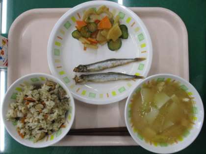 今日の給食は、豆入りひじきごはん、焼きししゃも、シャキシャキ野菜、白菜の味噌汁です。今日は食育の日、かむかむメニューです。焼きししゃもの頭を苦手とする子もいましたが、頭からしっぽまで食べられる栄養満点の食材なので、ぜひ丸ごと食べられるようになってほしいと思います。