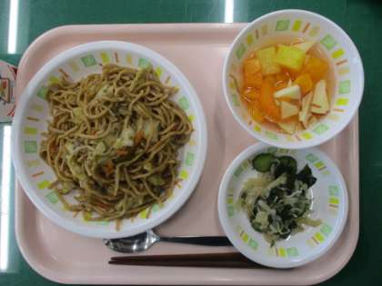 11月24日の給食は、ソース焼きそば、じゃこサラダ、フルーツポンチ、牛乳です。学校給食のソース焼きそばは、とんかつソースやウスターソース、しょうゆなどを使って味つけをしています。手作りならではのやさしい味つけのやきそばです。