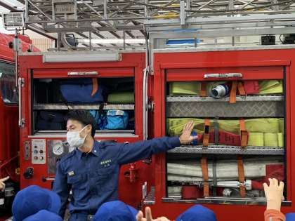 消防士の方から、消防車の種類や、扱っている道具についてや、実際に着替える様子などいろいろなことを教えていただきました。