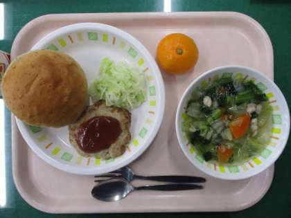 今日の給食は、豆腐入りバーガーサンド、白菜のスープ、みかん、牛乳です。今日は、豚肉と豆腐を混ぜてハンバーグを作りました。パンにハンバーグとキャベツソテーをはさんで、ハンバーガーにしていただきます。分厚くなるので、大きな口でほおばる姿が見られました。