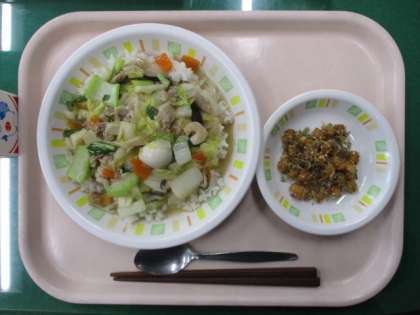 今日の給食は、中華丼、大豆とじゃこの甘辛揚げ、牛乳です。大豆とじゃこの甘辛揚げは、子どもたちから人気のあるメニューです。大豆をかためにゆで、歯ごたえを残して仕上げるのがポイントです。おかわりを求めて、たくさん行列ができていました。