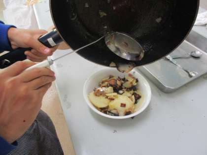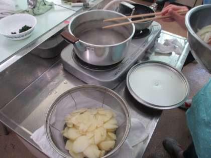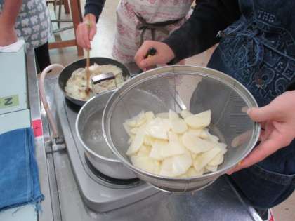 ベーコンポテトを作りました。ゆでたじゃがいもの水気を切り、玉ねぎ、パセリ、ベーコンと共に炒めました。準備から片付けまで、班で協力して取り組みました。想像以上においしくできました。