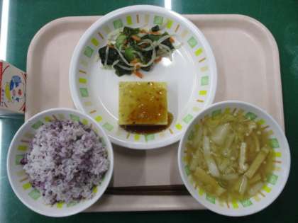 今日の給食は、ゆかりごはん、擬製豆腐のあんかけ、和風サラダ、白菜のみそ汁、牛乳です。擬製豆腐は、くずした豆腐に卵や野菜を入れて焼いたものです。見た目も味わいも上品な料理です。