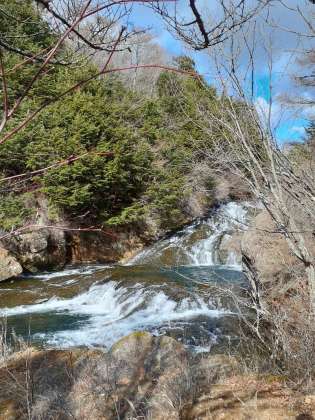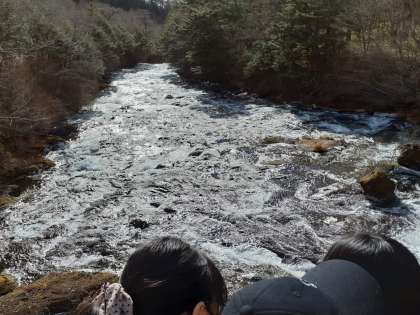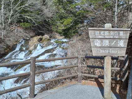 竜頭の滝を、上から、横から眺めてきました。湯ノ湖から流れる滝の水が所々凍っていました。