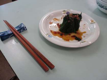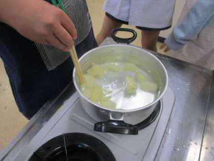 ほうれん草のおひたしと、ゆでいもを作りました。ほうれん草は根元を広げてきれいに洗い、じゃがいもは芽を取って皮むきをしました。盛り付けも上手にできました。あまり好きでなかったほうれん草も自分で作るとおいしくなる、との感想もありました。