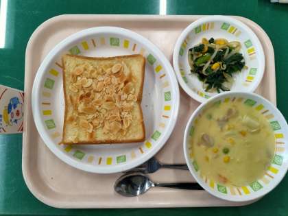今日の給食は、アーモンドトースト、コーンシチュー、ほうれん草サラダです。ほうれん草は、冬を代表する野菜です。1年中出回っていますが、冬のほうれん草は他の時季のものに比べ栄養価が高く、また甘味もあるので、これからの季節にたくさん食べたい野菜です。