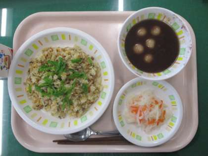 今日の給食は、そぼろごはん、紅白なます、白玉しるこ、牛乳です。1月11日は鏡開きでした。鏡開きは、鏡もちを木づちなどでたたき割って食べる行事です。もちを刃物で切るのは縁起が悪いので、木づちで割り、「開く」という言い方になったそうです。今日は、白玉もちを使っておしるこを作りました。甘いおしるこは、子どもたちにも大人気でした。