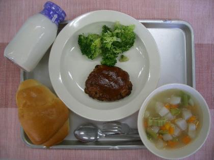 バターロール 牛乳 パスタ入りスープ アップルチーズハンバーグ ゆでブロッコリー