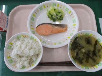 1月25日の給食は、麦ごはん、鮭の塩焼き、白菜のゆず漬け、みそ汁、牛乳です。学校給食週間2日目。この日は、給食が始まったといわれる明治22年の給食を再現しています。学校給食は、もともと貧しい子どもたちのためにお昼ごはんを提供したことが始まりとされています。
