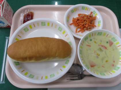 1月26日の給食は、コッペパン、イチゴジャム、クリームスープ、にんじんサラダ、牛乳です。学校給食週間3日目。昭和25年頃の給食を再現しました。太平洋戦争中は食べ物が不足し中断されていた学校給食ですが、戦争が終わり昭和22年ごろから再開されました。最初は脱脂粉乳や缶詰だけの給食でしたが、その後アメリカから小麦粉が贈られたことにより、パン・ミルク・おかずがそろった給食になりました。