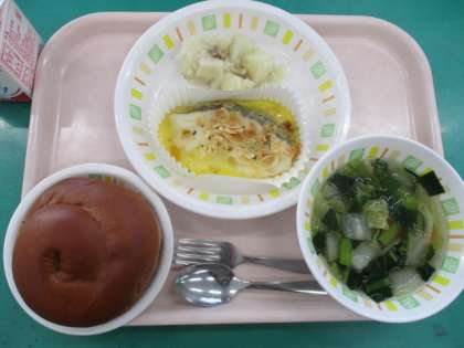 1月31日の給食は、ココアパン、たらのアーモンド焼き、ジャーマンポテト、白菜スープ、牛乳です。この日は「旬を食べよう」の日でした。冬が旬のたらに、白菜をたっぷり使ったスープを作りました。