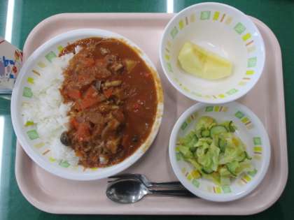 今日の給食は、ハッシュドポークライス、にんじんドレッシングサラダ、りんご、牛乳です。給食では、ドレッシングも毎回手作りをしています。今日は、ドレッシングににんじんのすりおろしを入れて作りました。にんじんが苦手な人にも食べやすいメニューです。