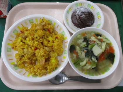 今日の給食は、パエリア、パスタスープ、ココアマフィン、牛乳です。今日はバレンタインメニューで、ココアマフィンを作りました。バレンタインといえばチョコレートですが、これは日本独自の文化です。外国では、お花やケーキ、メッセージカードを贈ることがあるそうです。