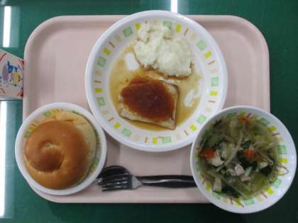 2月16日の給食は、パインパン、魚のバーベキューソース、じゃがいものクリームあえ、ベーコンと野菜のスープ煮、牛乳です。今日の魚は「めかじき」です。焼いためかじきに、バーベキューソースをかけていただきます。バーベキューソースは、しょうゆ、砂糖、酒などを合わせ、そこにりんごのすりおろしやレモン果汁を入れて作りました。さっぱりとした味わいがおいしいソースです。