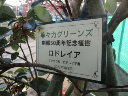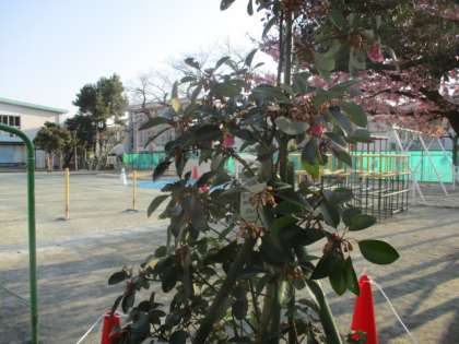 校庭の樹木に新しい仲間が増えました。3月6日(日)に、少年野球チーム「等々力グリーンズ」さんが創部50周年を記念して、校庭に記念樹を植える植樹祭を行いました。ロドレイアという木で、今週はピンク色のかわいい花が咲き始めました。