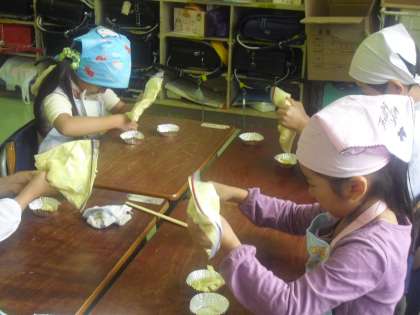 先日、和歌山県の三栖小学校からたくさんの大きなさつまいも(鳴戸金時)が届きました。三栖小学校は等々力小学校と交流活動をすすめている学校です。さつまいもは、三栖小学校の1年生・2年生が栽培し収穫したお芋です。心をこめて収穫したさつまいもを使わせていただき、等々力小学校の1年生がスィートポテト作りに挑戦しました。「ほっぺが落ちそうなくらいおいしいです。」「夢の中にいるみたいにおいしいです。」子どもたちは、輝く笑顔で、スィートポテトのおいしさを表現していました。三栖小学校の1年生の皆さん、2年生の皆さん、おいしいさつまいもをありがとうございました。