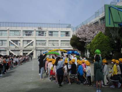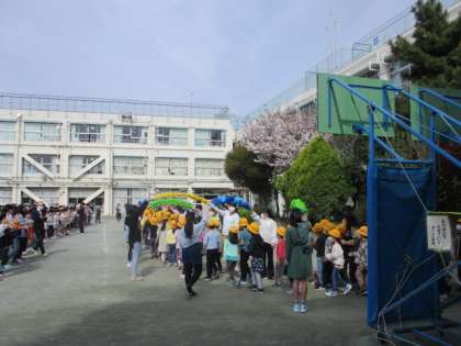 4月11日(月)、校庭で1年生を迎える会を行いました。花のアーチをくぐって入場しました。