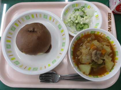 今日の給食は、ココアビスキュイパン、ボルシチ、白菜とチーズのサラダ、牛乳です。ココアビスキュイパンは、パンの表面にビスキュイ生地をぬって焼いたものです。ほんのり甘く、しっとりとしたビスキュイパンは、子どもたちから人気があります。