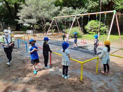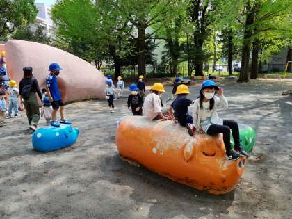 快晴に恵まれ、駒沢公園での遠足が始まりました。2年生のリーダーシップで、1年生からブランコに乗せてあげたり、まとまつて遊べるように声をかけたりしています。1年生も楽しそうです。