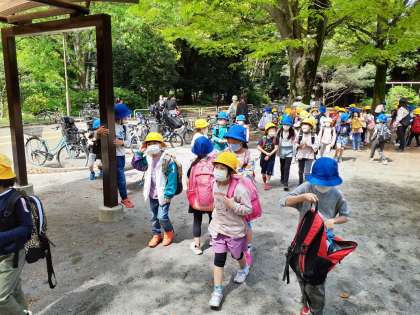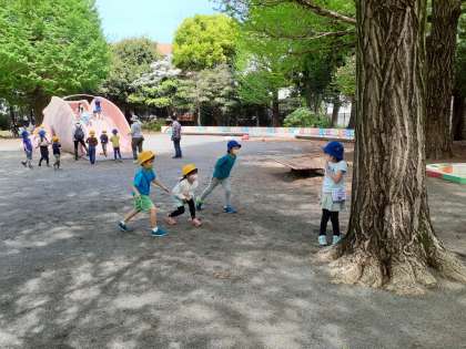 ぶた公園で「だるまさんがころんだ」やブランコ、滑り台で遊んだ子どもたちは、次は、りす公園に移動して遊びます。