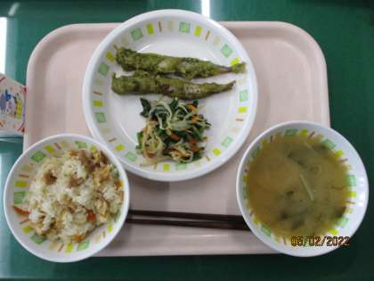 今日の給食は、子ぎつねごはん、ししゃもの新茶揚げ、野菜のからしじょうゆかけ、大根のみそ汁、牛乳です。今日は八十八夜メニューです。八十八夜は、立春から数えて88日目のことで、この日に摘んだ新茶を飲むと病気にならないと言われています。今日は、ししゃもの天ぷらの衣に、お茶の葉を混ぜました。