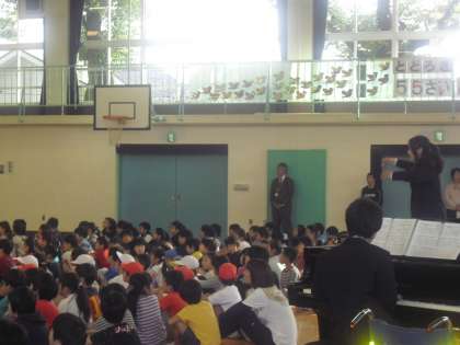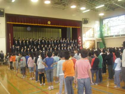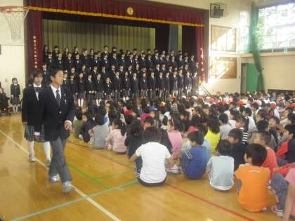 11月4日(金)音楽朝会時に東深沢中学校1年生による合唱発表を行いました。東深沢中学校では10月29日(土)に学習発表会が行われ、合唱コンクールも実施されました。今日は、その成果を等々力小学校の全校児童に披露してくれました。小学校を卒業して半年・・・中学生として大きく成長した姿を見せてくれました。指揮もピアノ演奏もあいさつも、すべて中学1年生の生徒たちが立派に行いました。体育館いっぱいに素敵な歌声が響き渡り、小学生たちも感動の拍手をおくっていました。