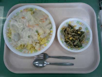 6月9日の給食は、ドリア風、大根とひじきのサラダ、牛乳です。ドリア風は、カレー粉を入れて炊いたごはんに、シーフードや鶏肉の入ったホワイトソースをかけていただきます。子どもたちにも人気のある、給食の定番メニューです。