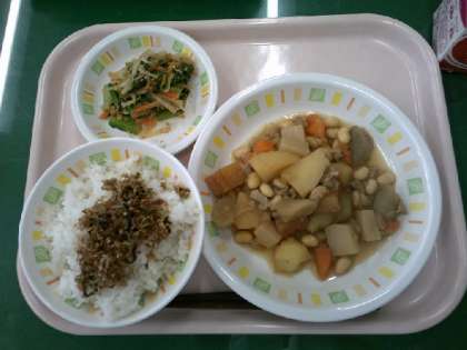 今日の給食は、麦ごはん、豆入り筑前煮、かみかみ佃煮、野菜のごまだれかけ、牛乳です。今日はかむかむメニューです。かみかみ佃煮は、じゃこや塩昆布などが入っています。じゃこはオーブンでカリッと焼いているので、かみごたえがあります。