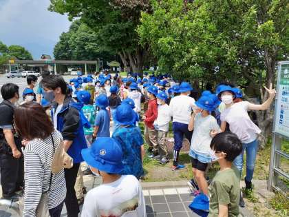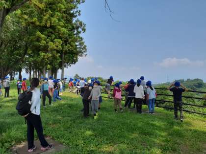 赤城高原PAでトイレ休憩をしました。天気が良く、安心しています。クラス写真を撮影する予定でしたが、背景の山並みが霧で白くなっているので、宿舎前での撮影に変更します。