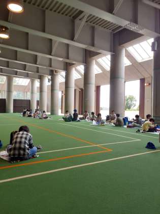 なかのビレジの屋根付き広場でお弁当を食べています。