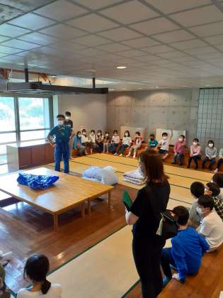 なかのビレジでは、補助員さんに布団の敷き方を教わっています。