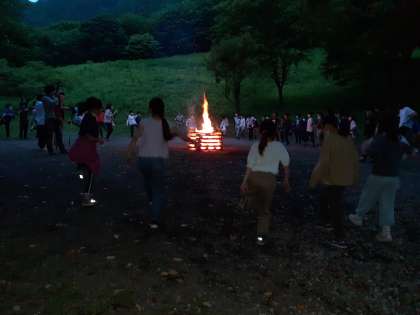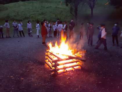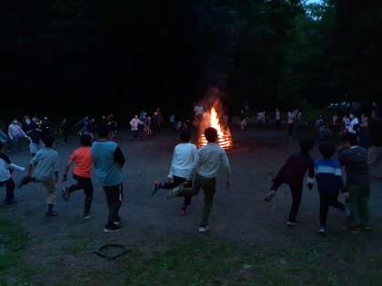 天候が危ぶまれていましたが、キャンプファイアを無事に終えることができました。火之神と火之子たちによる点火で始まり、火を囲んでのダンスを楽しみました。最後に火のはぜる音を静かに聴いて終わりました。