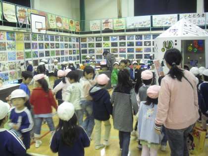今日は、児童相互鑑賞日でした。今日にあわせて、三島幼稚園・深沢幼稚園・ナオミ保育園の子どもたちも鑑賞に来ました。三島幼稚園は1年生と、ナオミ保育園は5年生と交流しました。