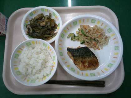 今日の給食は、ごはん、さばのスタミナ焼き、きざみこんぶの五目煮、ごま酢あえ、牛乳です。さばは、しょうがやにんにく、玉ねぎ、りんごをすりおろして調味料と一緒に漬け込みました。調味料にはトウバンジャンを少し入れ、少しピリ辛のごはんがすすむ味つけです。