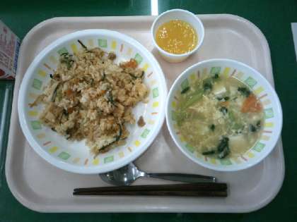 今日の給食は、プルコギごはん、中華風コーンスープ、つぶつぶオレンジゼリー、牛乳です。プルコギは、韓国料理の中でも有名な肉料理です。韓国語で「プル」は「火」を、「コギ」は「肉」を意味します。日本で肉を焼く料理といえば焼き肉をイメージしますが、プルコギは、焼き肉とすき焼きの中間のような料理です。今日は、そんなプルコギの具を作り、ごはんに混ぜてプルコギごはんにしました。