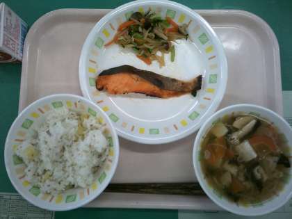 今日の給食は、さつまいもごはん、鮭のみそこうじ焼き、きのこ入りおひたし、吉野汁です。今日は「旬を食べよう」の日です。さつまいもを一緒に炊き込んだごはんは、ほのかに甘さを感じるやさしい味わいです。