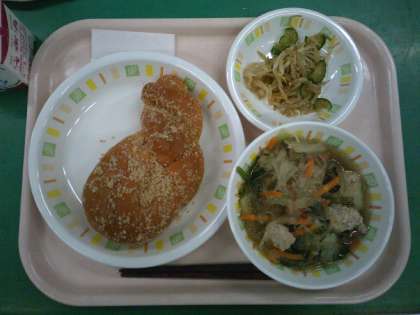 今日の給食は、あげパン、豆腐団子と春雨のスープ、もやしときゅうりのごま風味、牛乳です。今日は人気のあげパンです。久しぶりのあげパンだったこともあり、みんな喜んで食べていました。