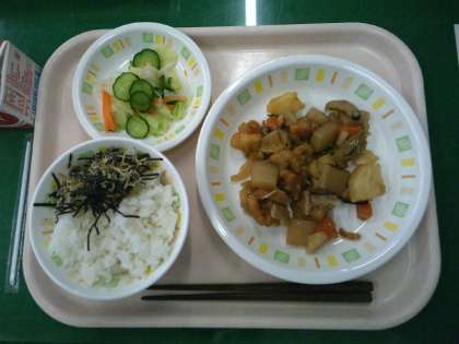 今日の給食は、ごはん、揚げ煮、じゃこふりかけ、ひとしお野菜、牛乳です。揚げ煮は、じゃがいもと鶏肉を油で揚げ、ベースの煮物に混ぜました。一度油で揚げているので、味がよくからみます。こんにゃくやたけのこなど、かみごたえのある食材も入っているので、よくかんでいただきましょう。