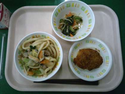 今日の給食は、ちゃんこうどん、五平もち、ごまドレサラダ、牛乳です。五平もちは、長野県や岐阜県、愛知県などに伝わる郷土料理です。給食室で1つずつ丸め、甘みそダレをぬってオーブンで焼きました。